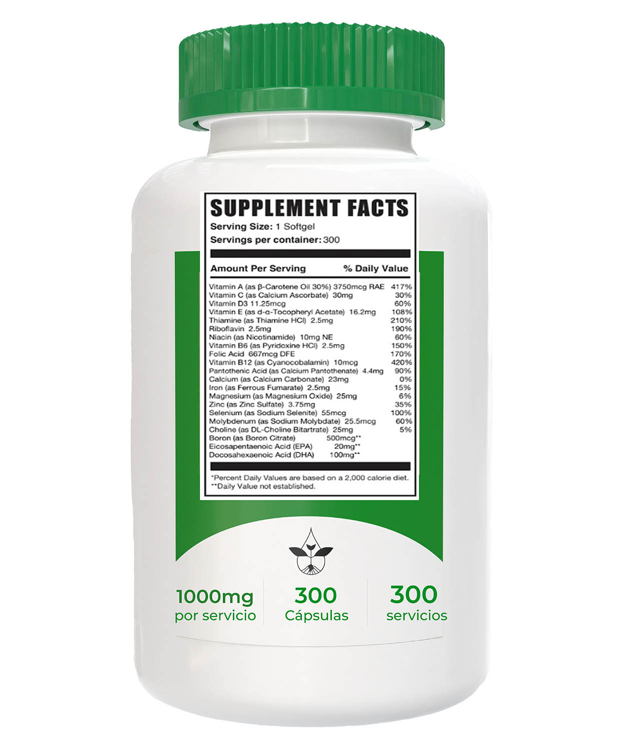 Vitamina A. Vitamina B6. Vitamina B12 . Vitamina C . Vitamina D3. Vitamina E. Tiamina. Riboflavina. Niacina. Ácido fólico . Ácido pantoténico . Calcio (como carbonato de calcio). Hierro . Magnesio. Cinc. Selenio. Molibdeno. Colina. Boro. Ácido Eicosapentaenoico. Ácido docosahexaenoico