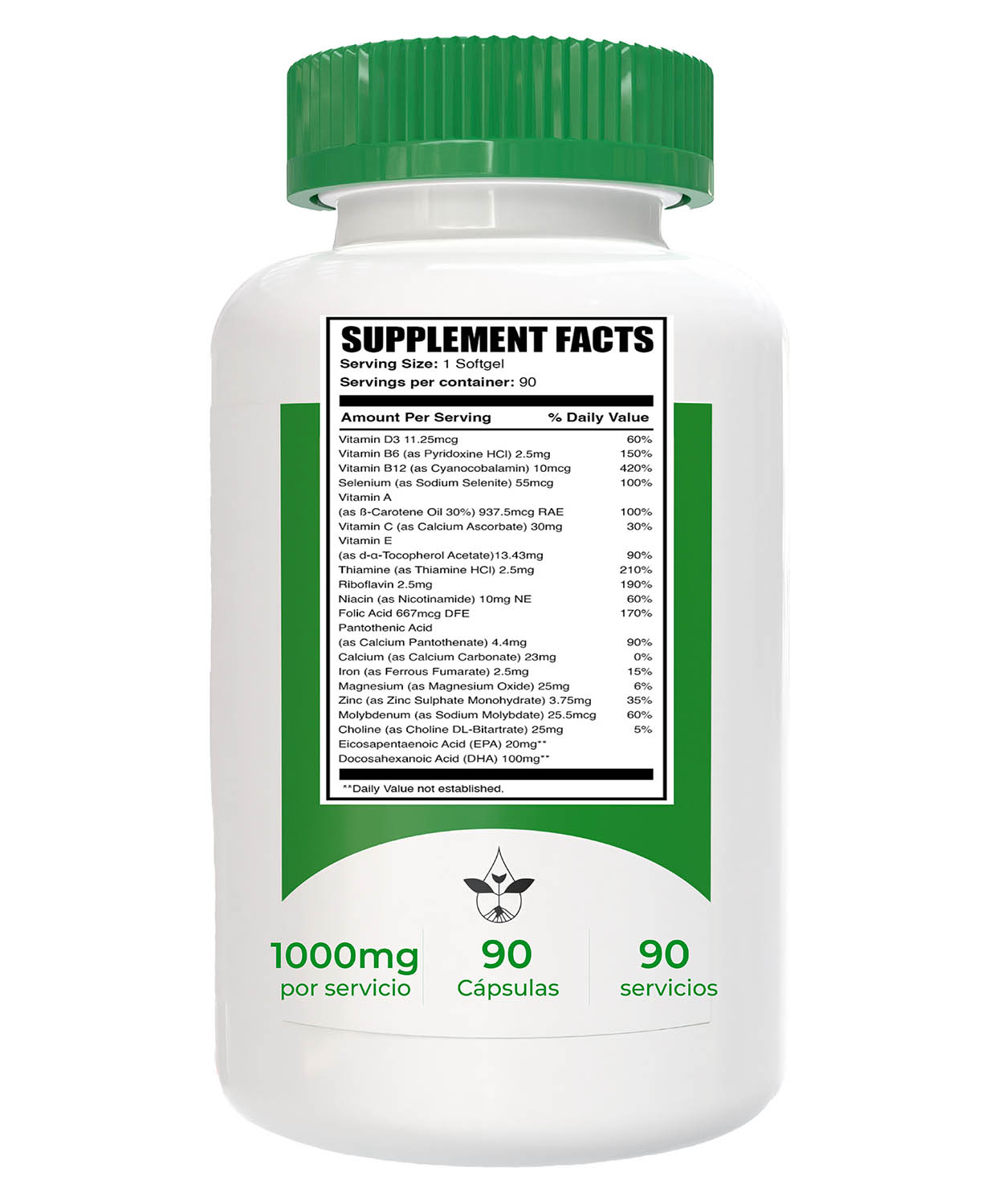 Vitamina A. Vitamina C . Vitamina E. Tiamina. Riboflavina. Niacina. Ácido fólico . Ácido pantoténico . Calcio (como carbonato de calcio). Hierro . Magnesio. Cinc. Molibdeno. Colina. Boro. Ácido Eicosapentaenoico. Ácido docosahexaenoico