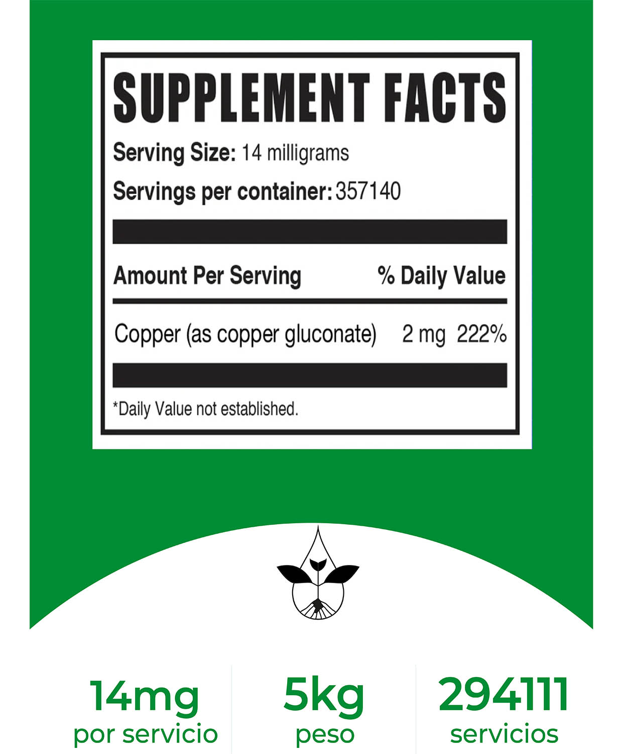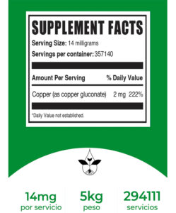 Uso sugerido: El cobre es potencialmente TÓXICO cuando se toma en exceso. Se requiere una escala analítica de miligramos para medir este suplemento. NO exceda los 4 miligramos de cobre elemental por día.
