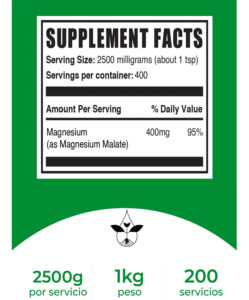 Nuestro malato de magnesio en polvo es un suplemento dietético a base de magnesio que proporciona numerosos beneficios para la salud de todo el cuerpo, con 400 mg de magnesio puro por porción.