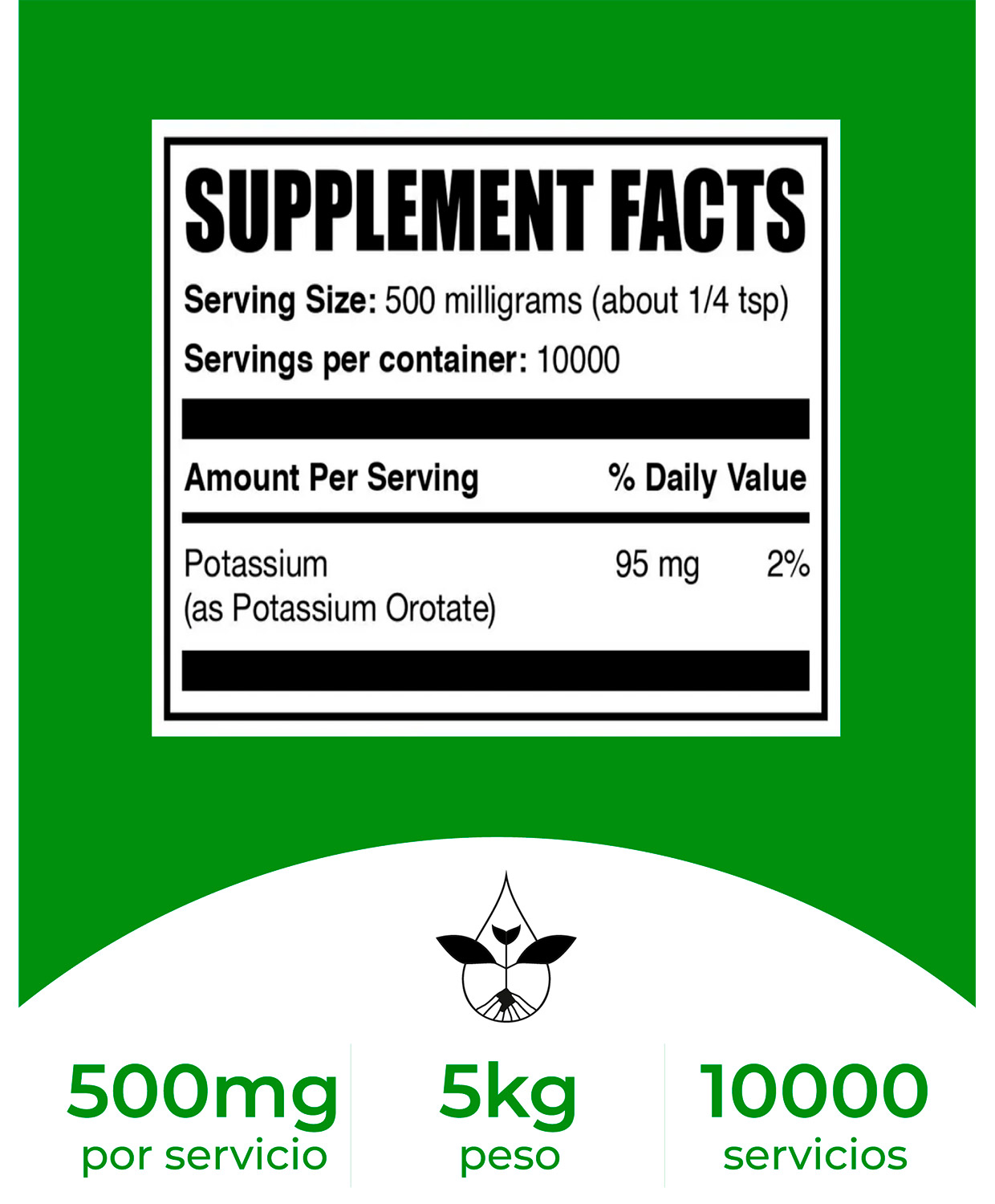 El orotato de potasio actúa como fuente de potasio, que favorece la función nerviosa saludable y apoya la función de los músculos y el corazón. El potasio también es un electrolito importante que ayuda a mantener la hidratación del cuerpo.
