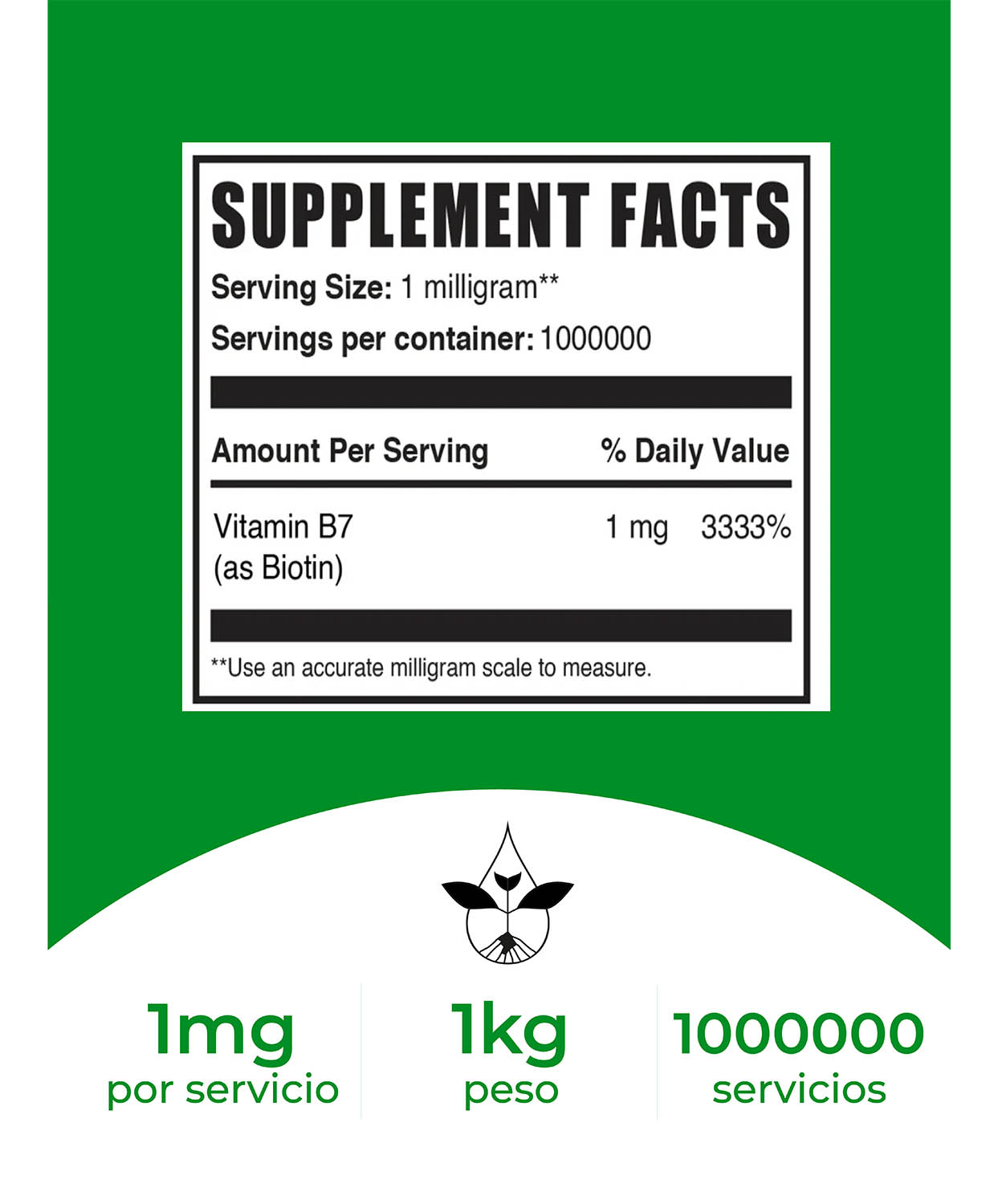 Uso sugerido: Este producto es completamente puro y debe tomarse con extrema precaución. Como suplemento dietético, tomar 1 mg diariamente, o según lo indique un médico. Usar una balanza de microgramos para una medición precisa.